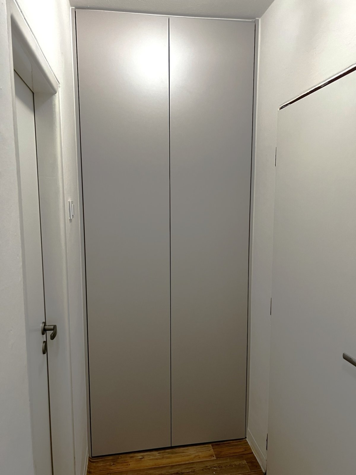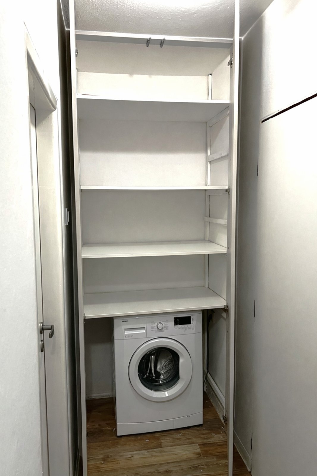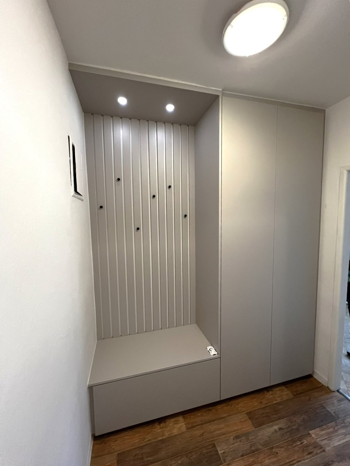 - předsíň s vestavnou skříní ve které je schovaná pračka a krásným vestavným botníkem se skříní