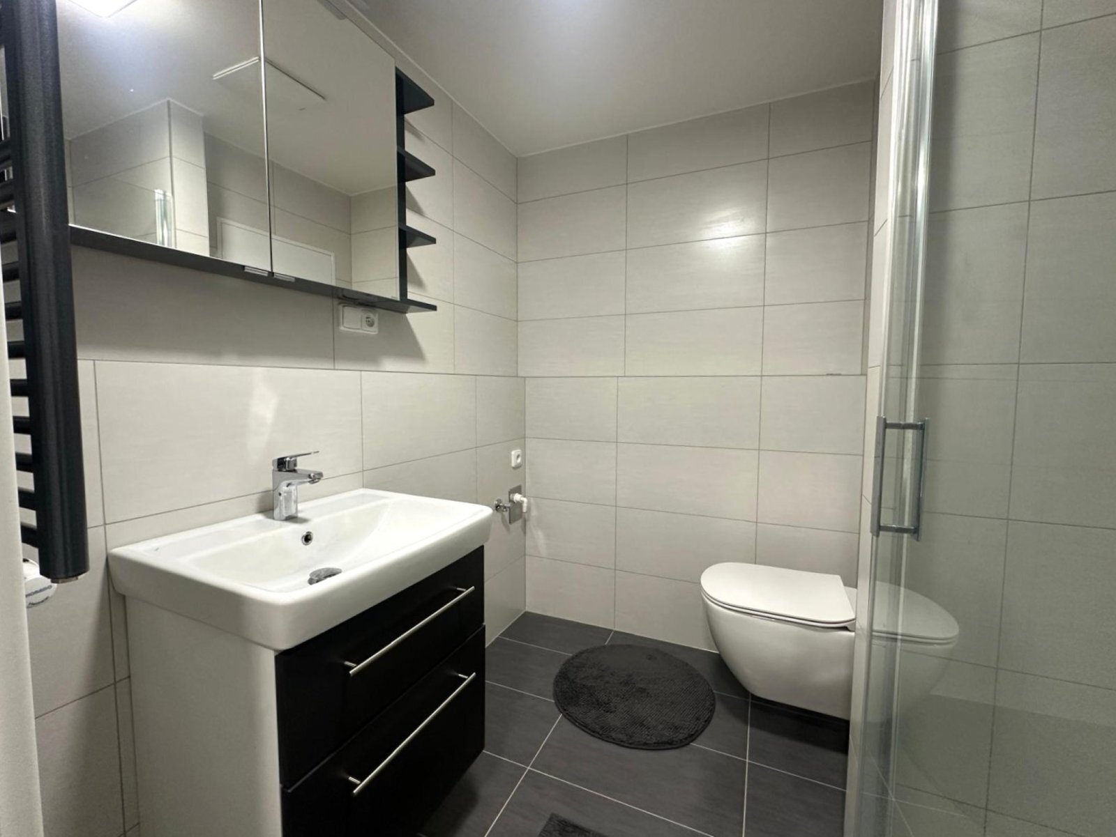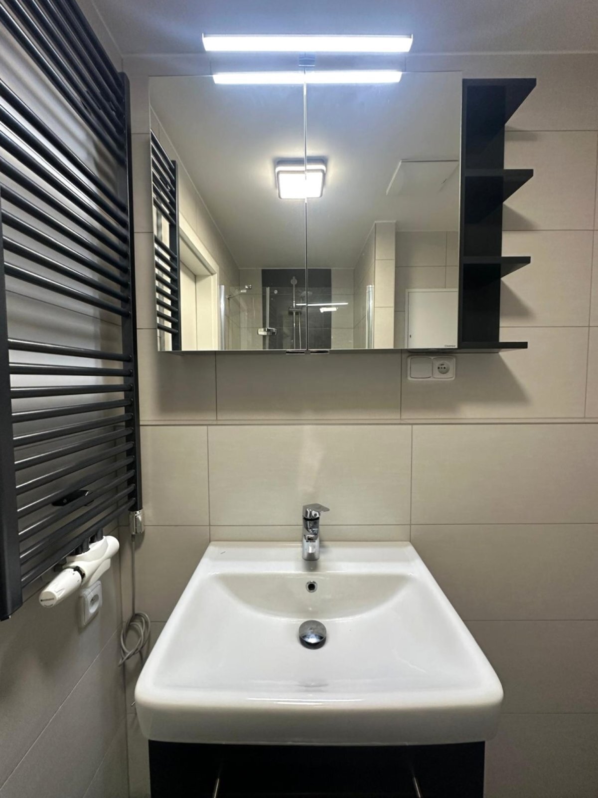 Dispozice bytu nabízí vstupní chodbu, samostatnou šatnu, koupelnu se sprchovým koutem, umyvadlem, skříňkami, WC a otopným žebříkem. V koupelně je také přípojka na pračku.