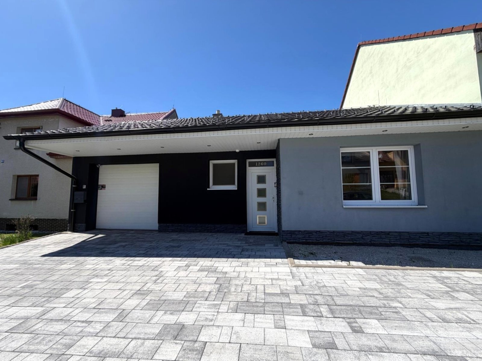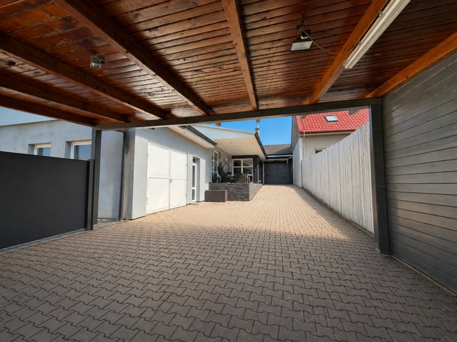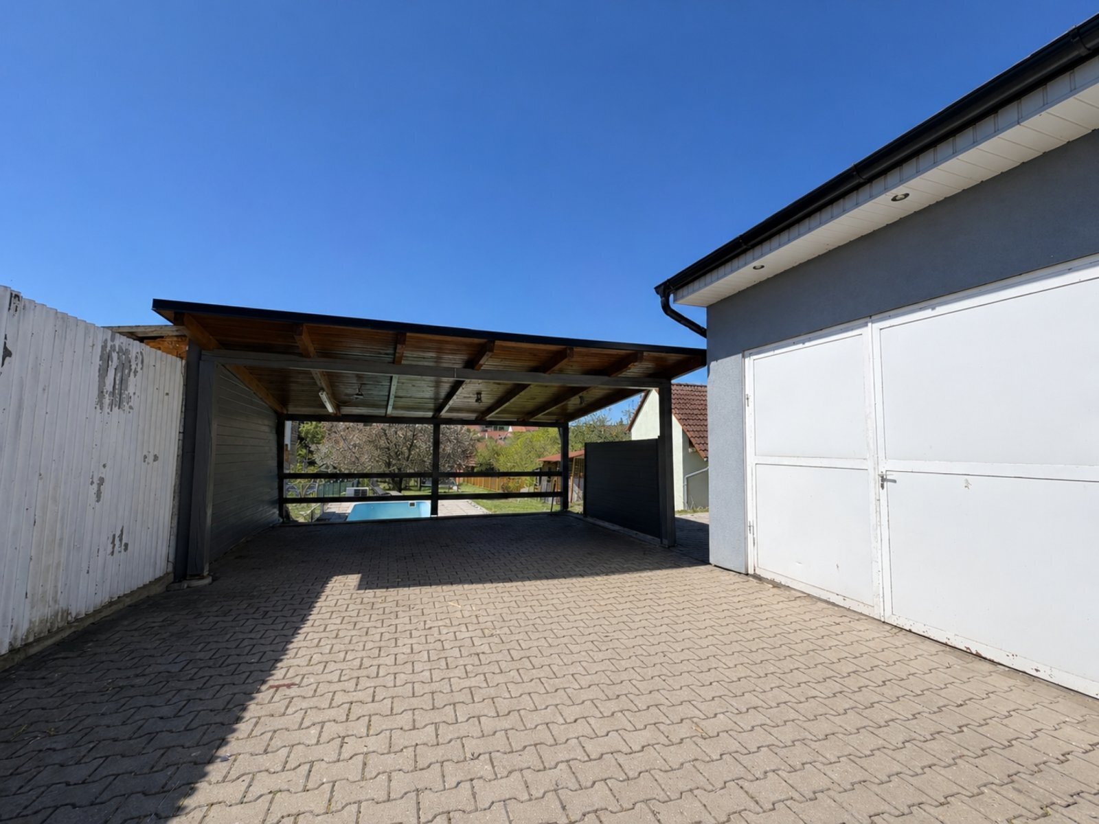 Dům je částečně podsklepen (sklep pod terasou). Na pozemku se dále nachází garáž s WC, dvě krytá parkovací stání ve dvoře a další před domem. Součástí nemovitosti je velká, rovinatá zahrada, která nabízí dostatek prostoru pro rodinné aktivity, odpočinek i případné další využití (např. zahradní domek, dětské hřiště apod.). Pozemek není svažitý, což výrazně zvyšuje jeho praktičnost a komfort užívání.