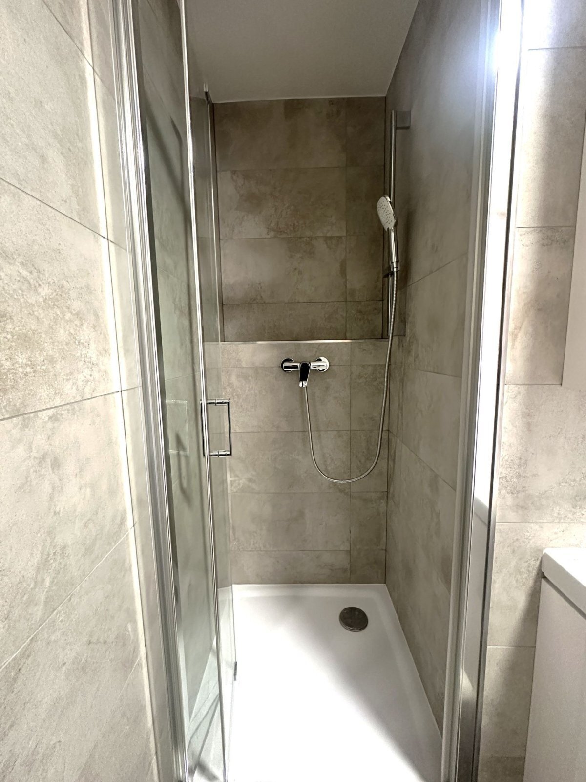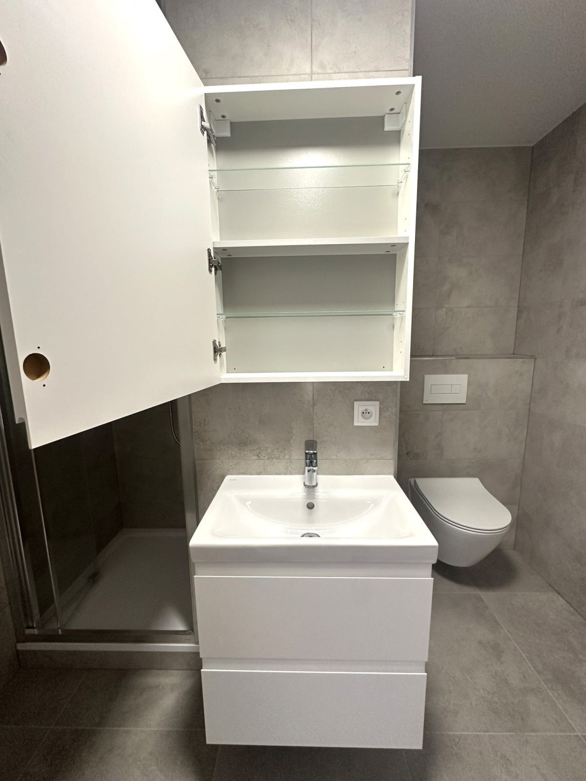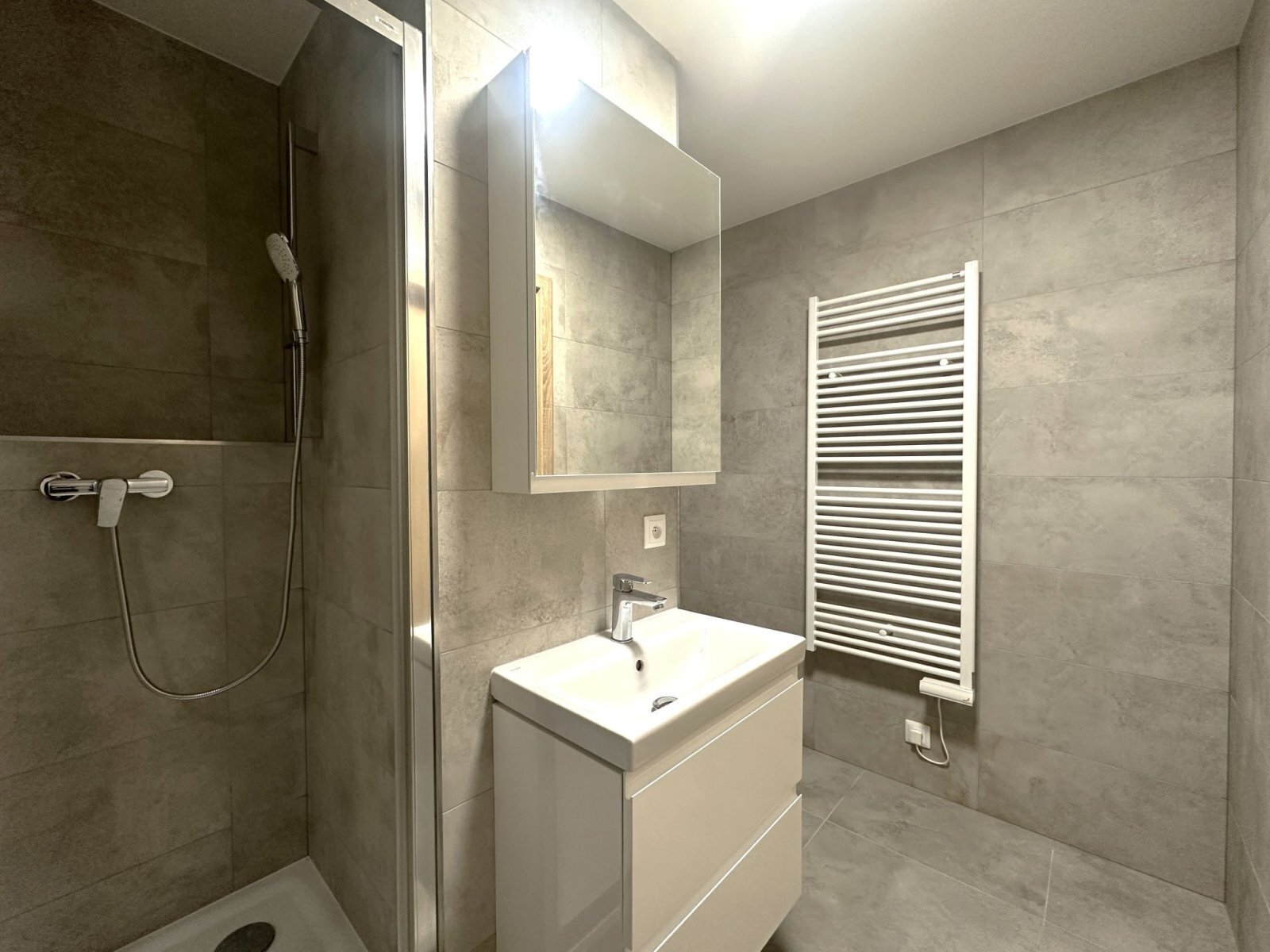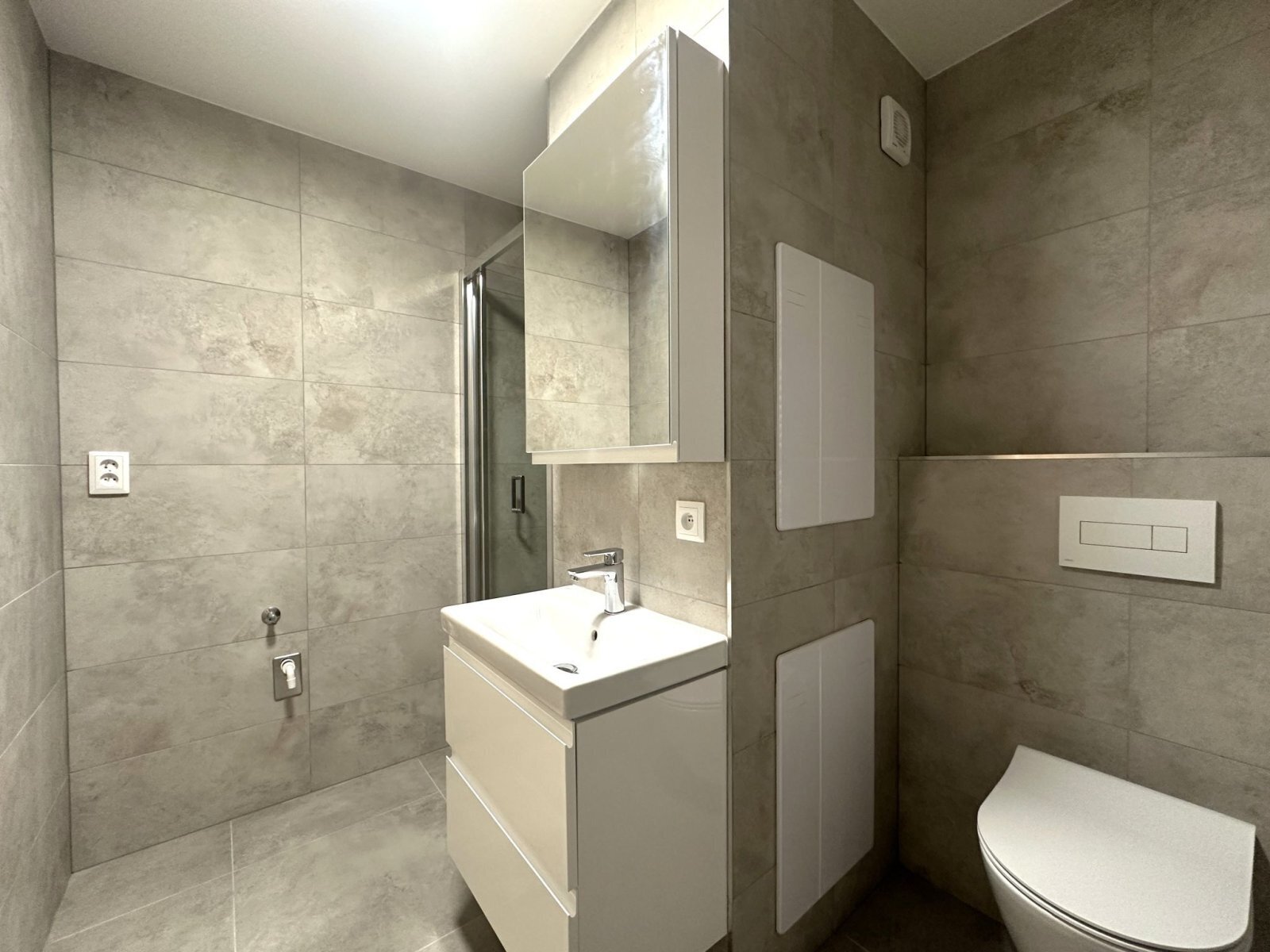 - koupelna je vybavena sprchovým koutem, umyvadlem se skříňkou, WC, otopným žebříkem, ventilátorem a přípojkou na pračku