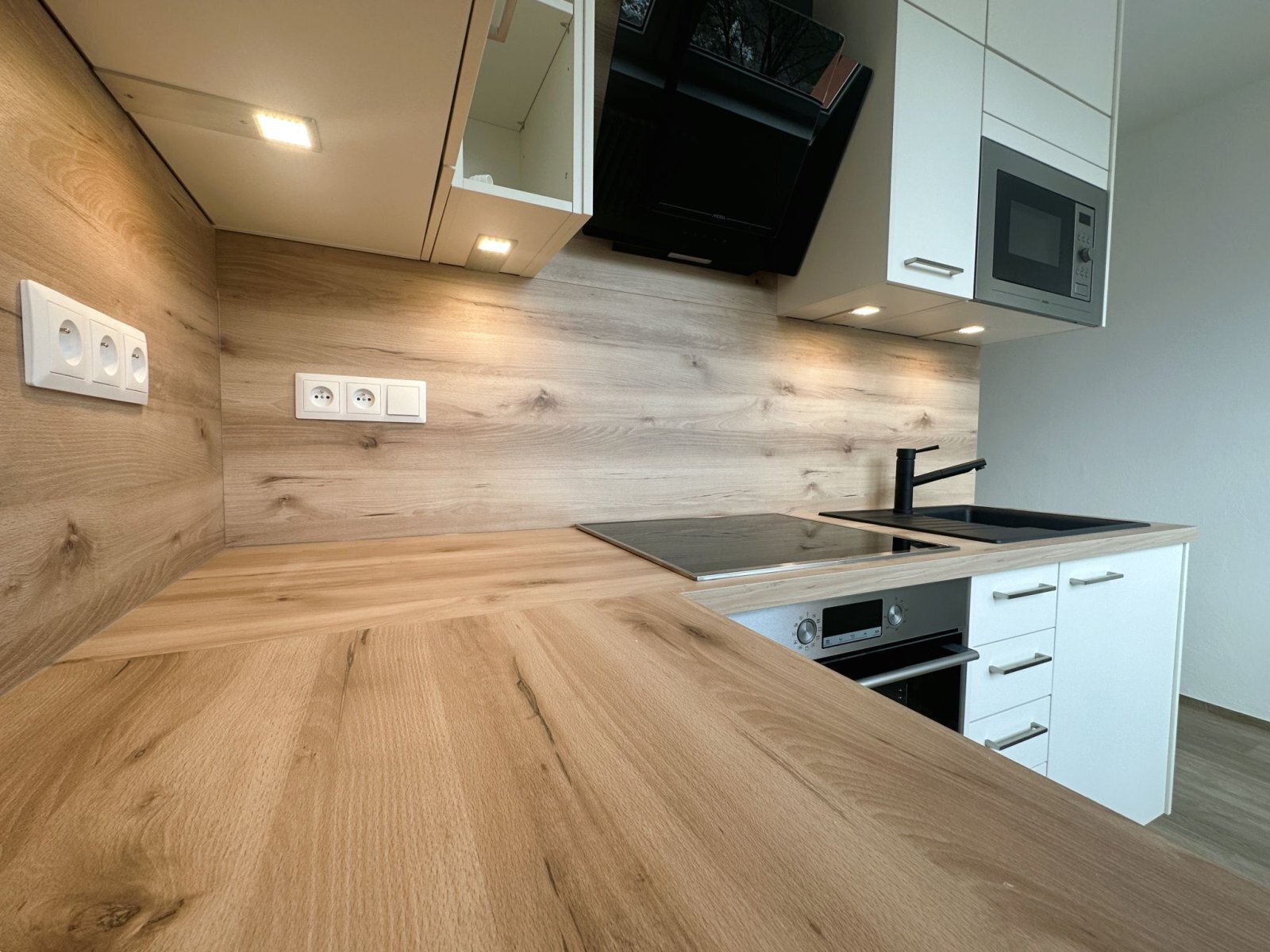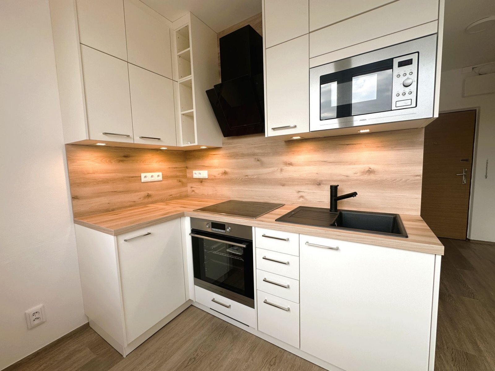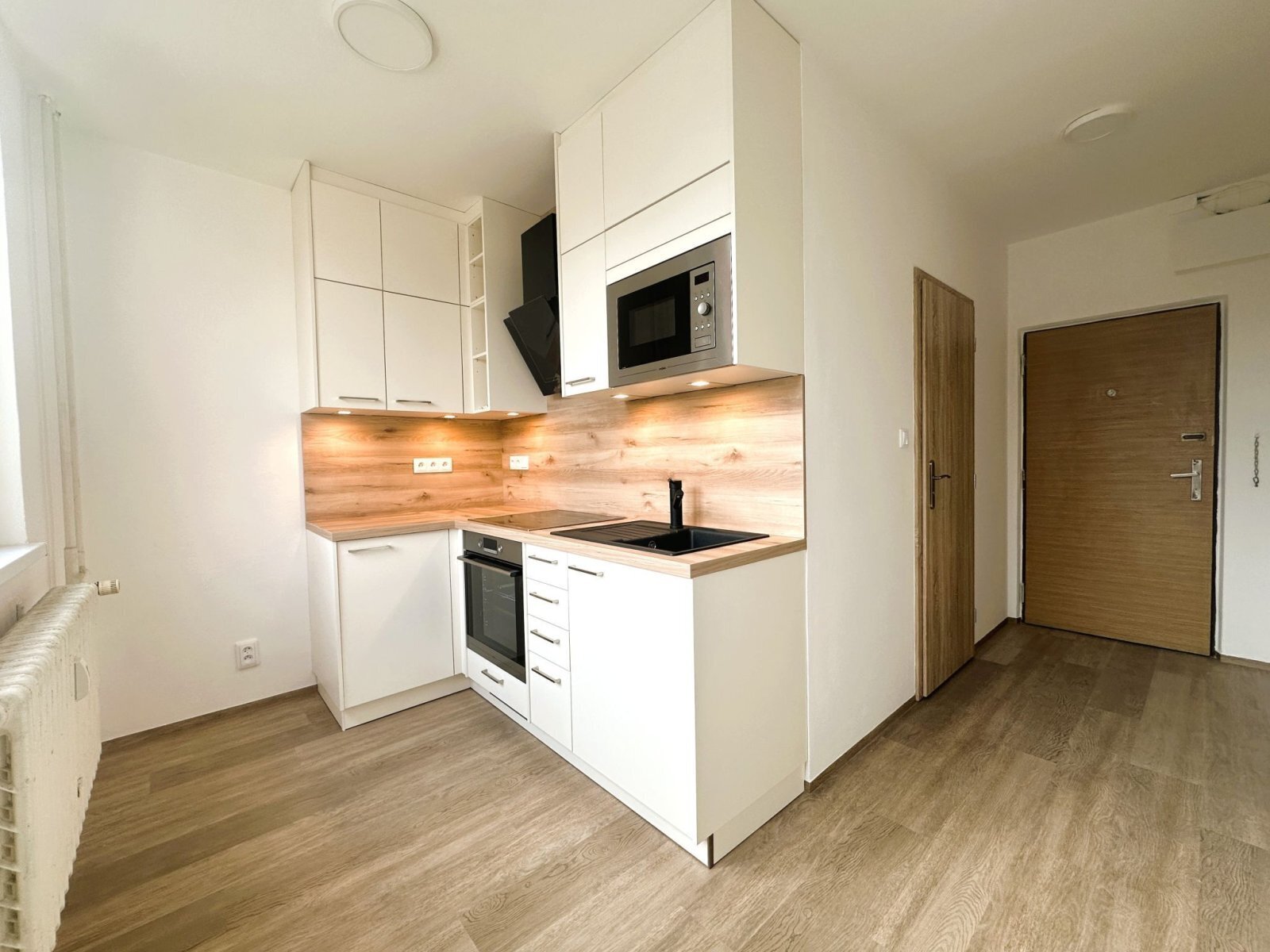 - kuchyňská linka je vybavena troubou, indukční varnou deskou, digestoří a mikrovlnnou troubou, k dispozici je také prostor pro lednici