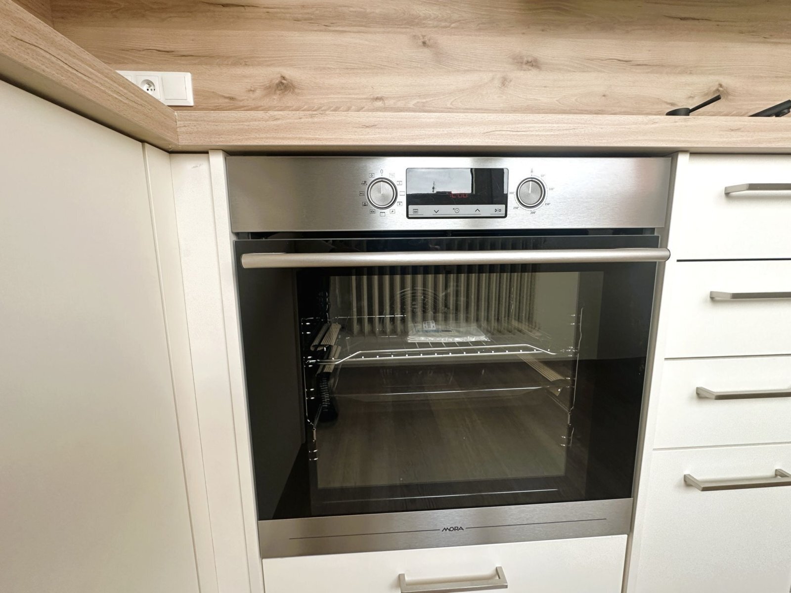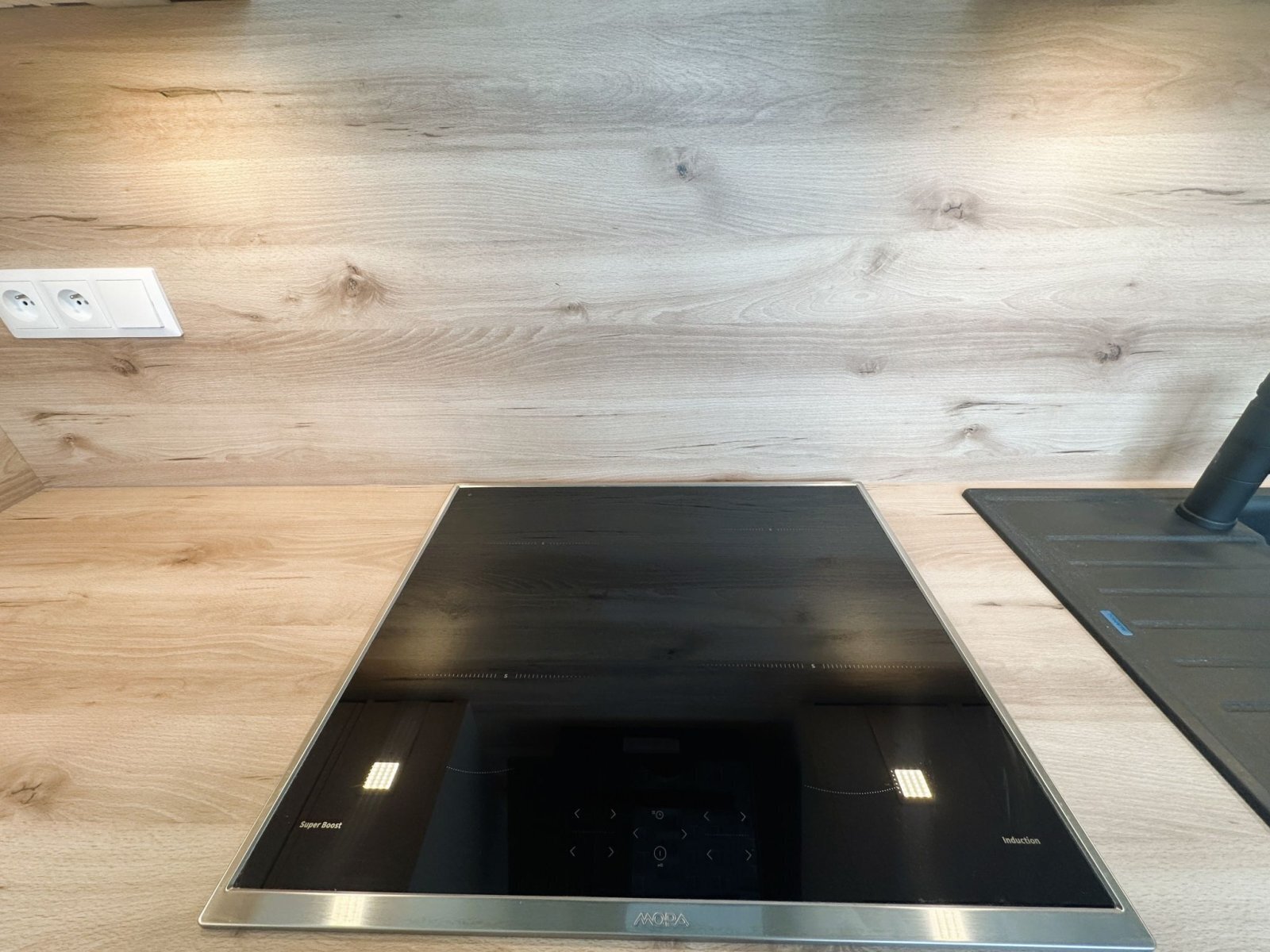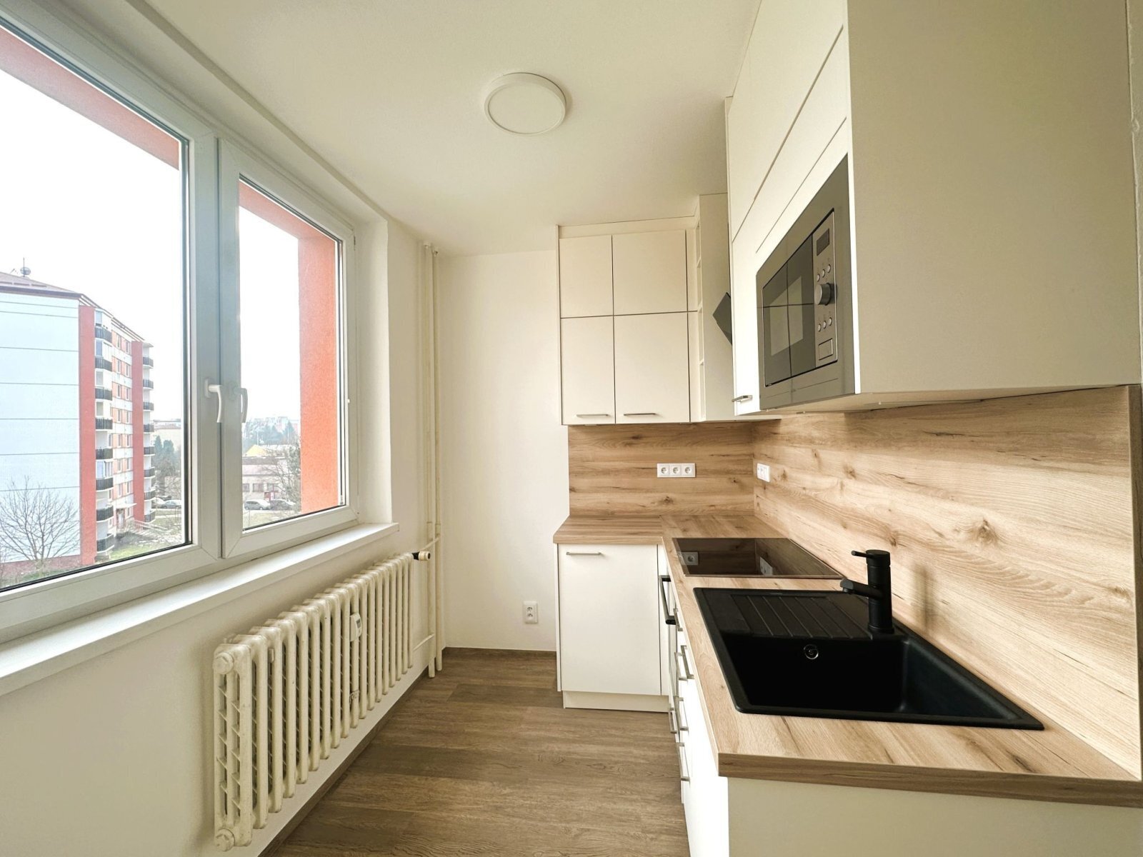 - kuchyňská linka je vybavena troubou, indukční varnou deskou, digestoří a mikrovlnnou troubou, k dispozici je také prostor pro lednici