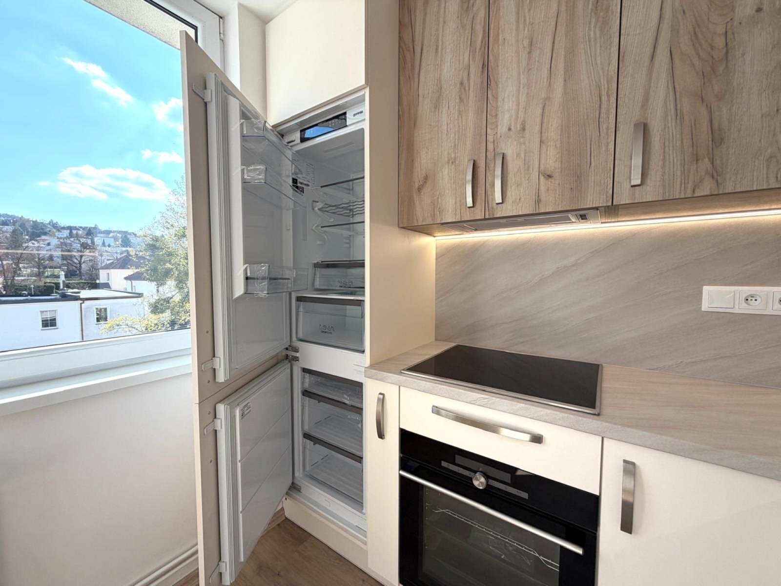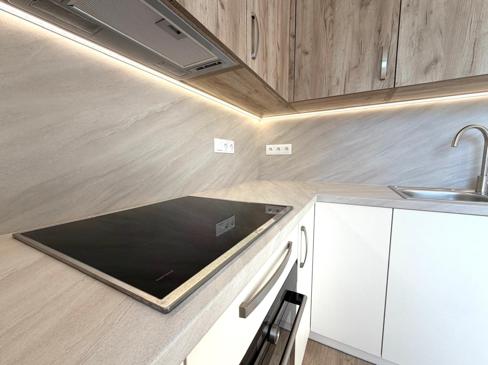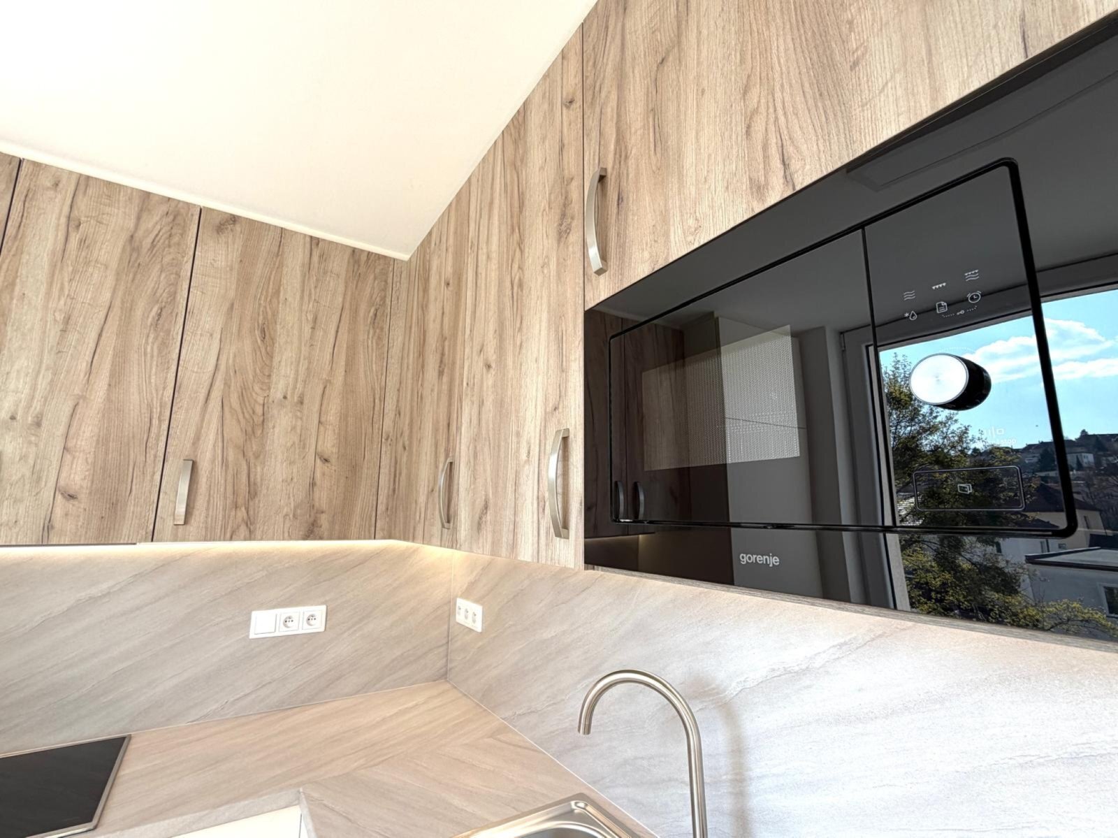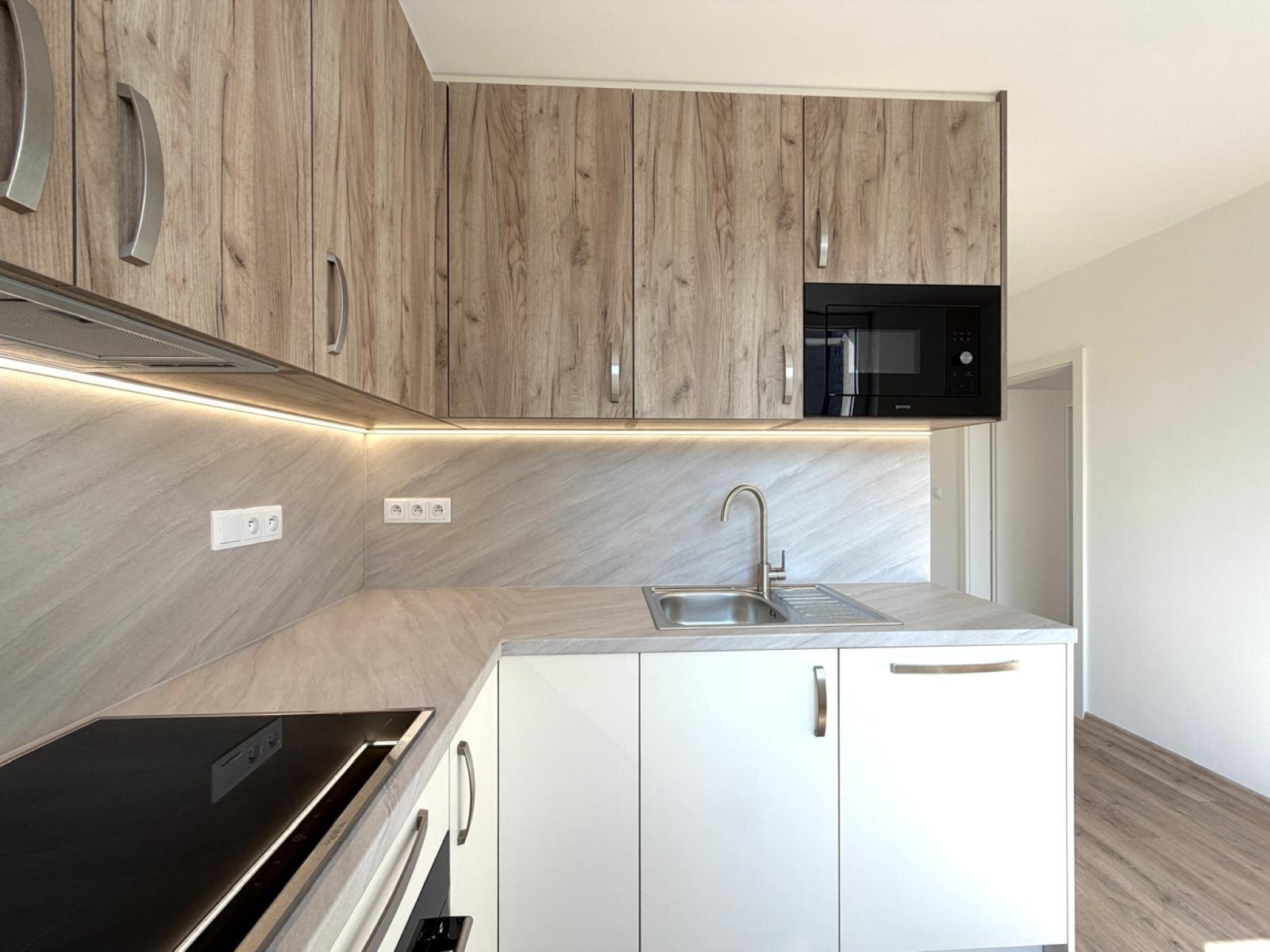 - moderní kuchyňská linka s vestavnými spotřebiči - indukční varná deska, elektrická trouba, digestoř, mikrovlnná trouba, myčka nádobí, lednice s mrazákem