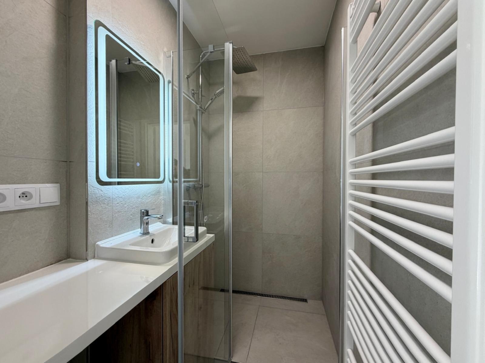 - koupelna se sprchovým koutem, umyvadlem, zrcadlem a otopným žebříkem