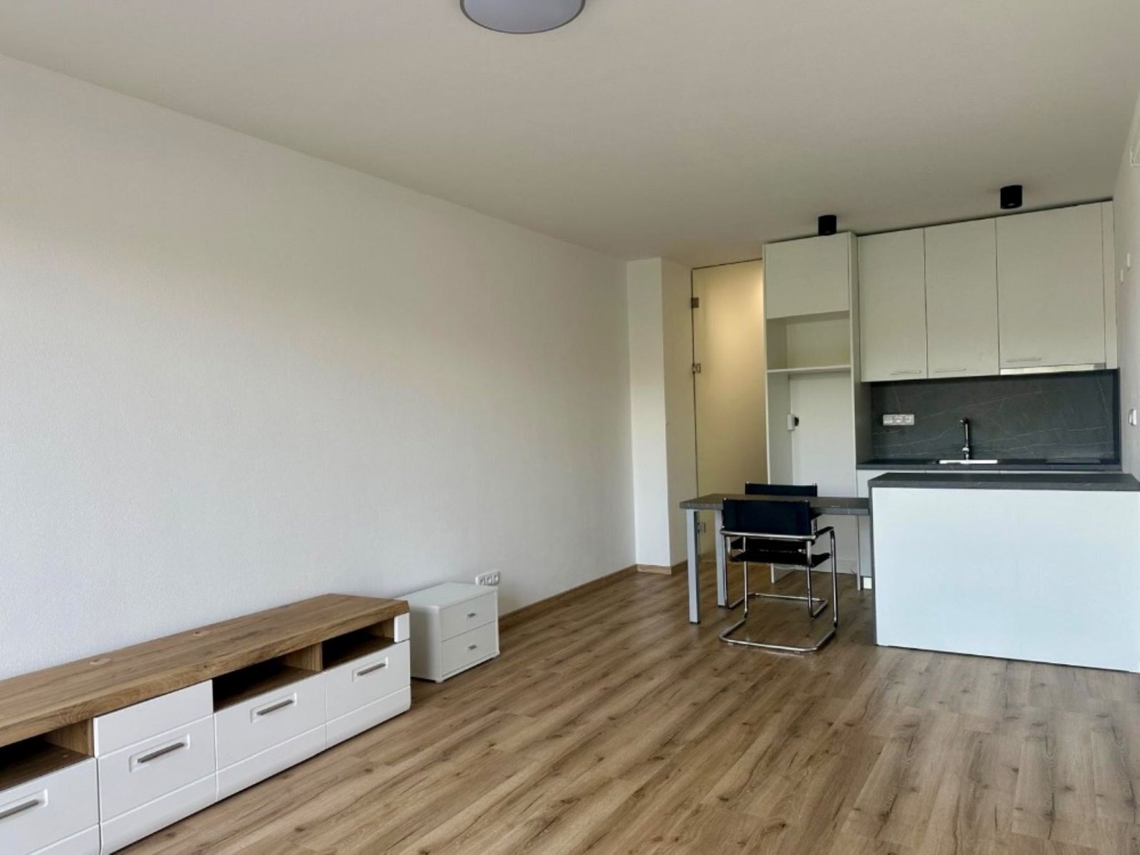 - v obývací části skříňka pod TV, noční stolek