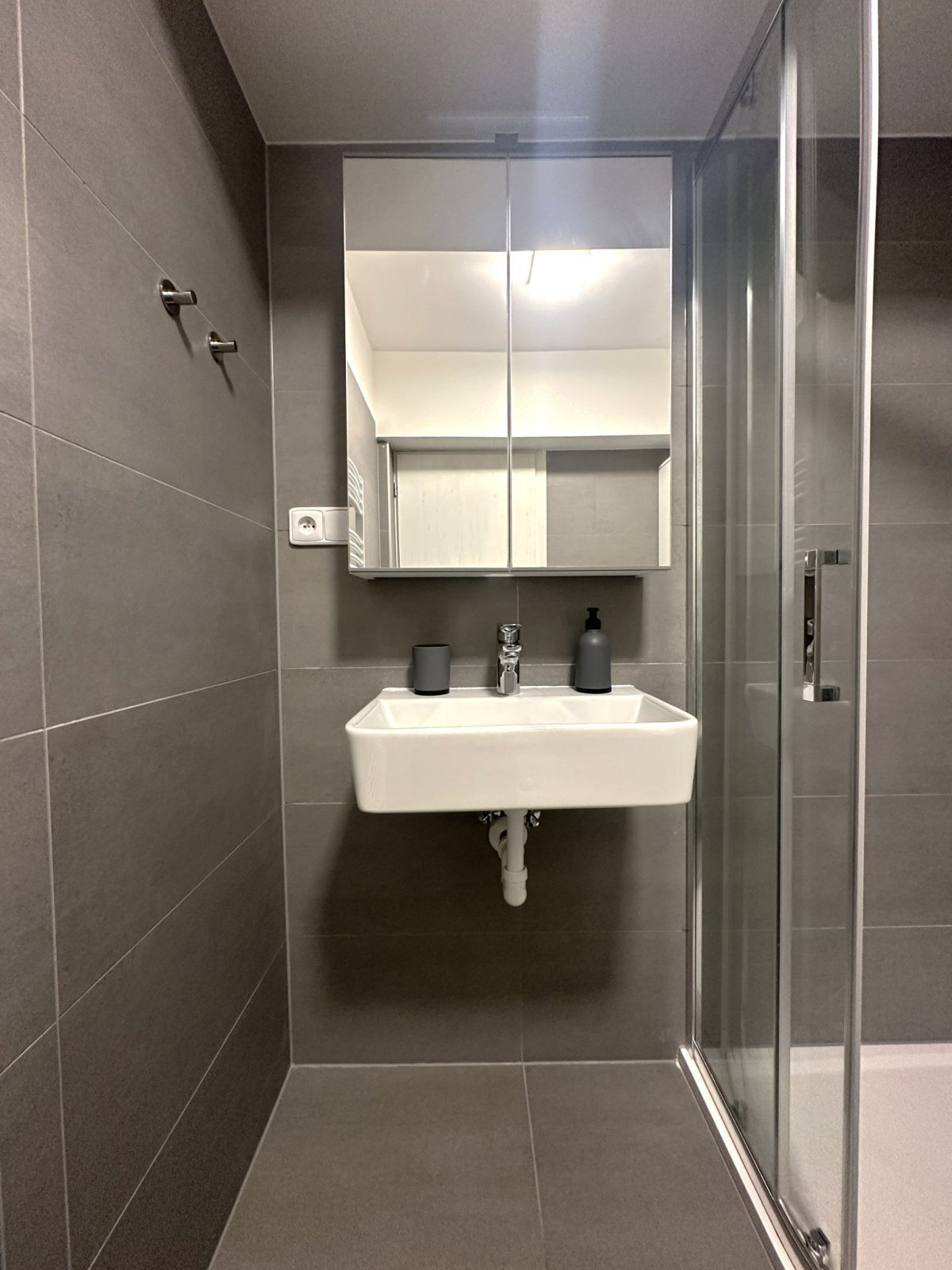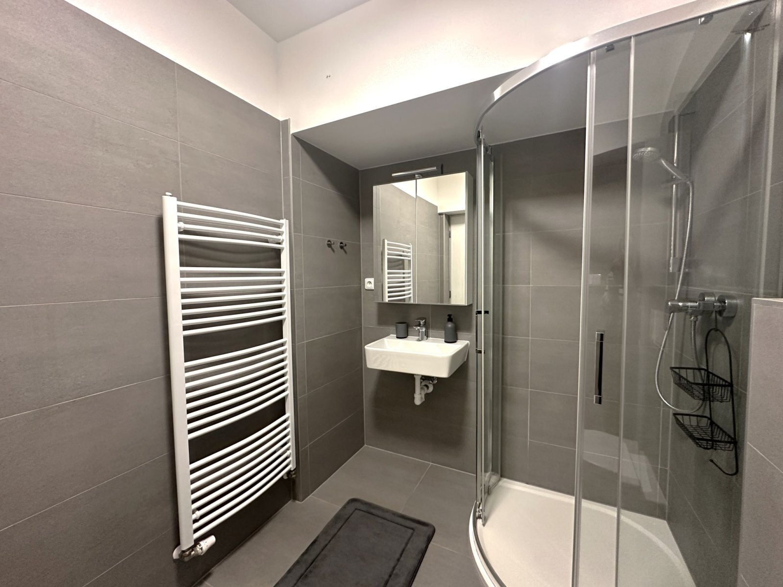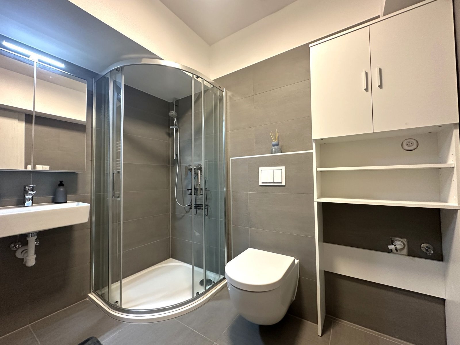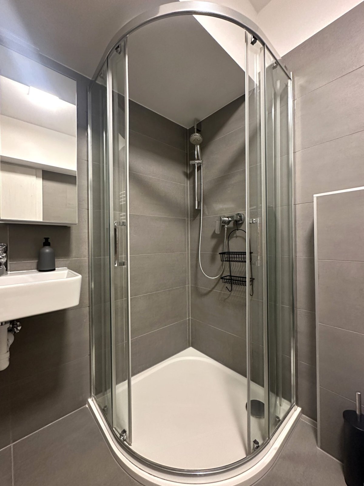 - koupelna disponuje sprchovým koutem, WC, umyvadlem se skříňkou a zrcadlem a přípojkou na pračku