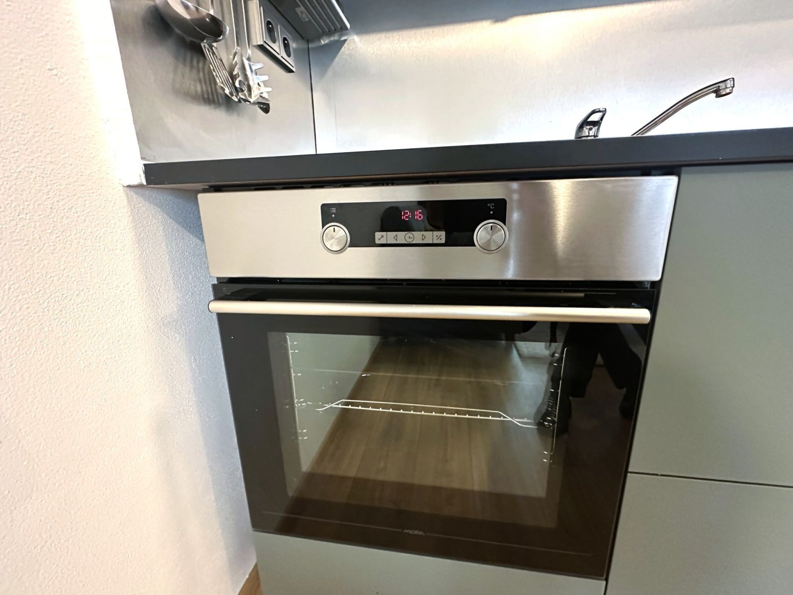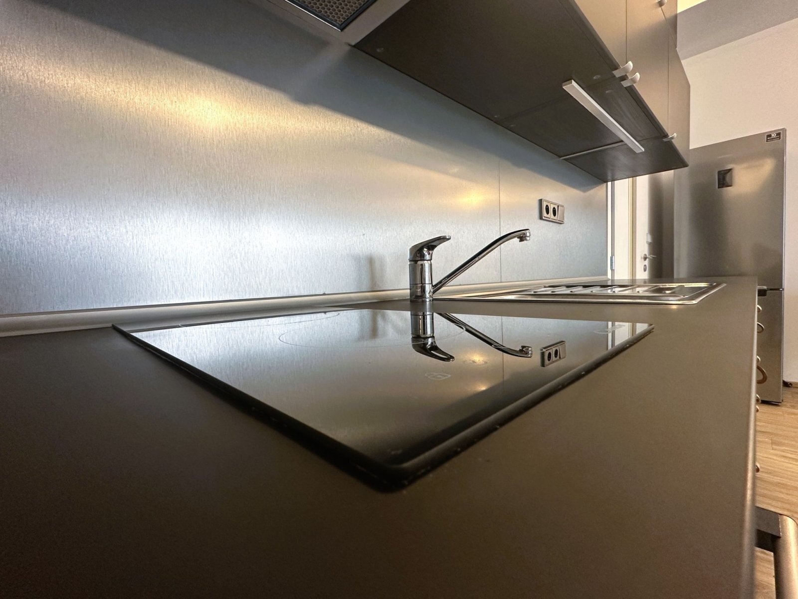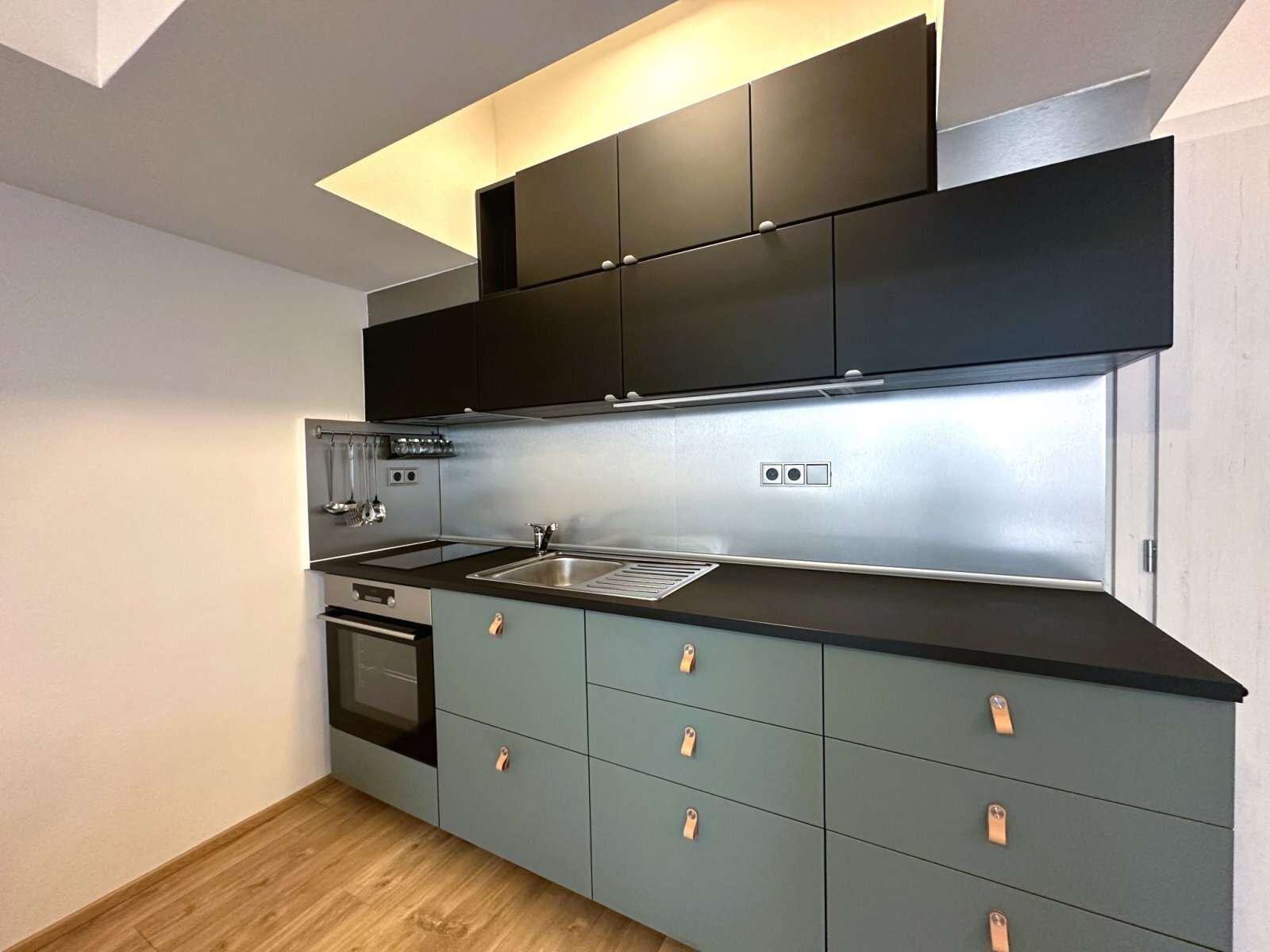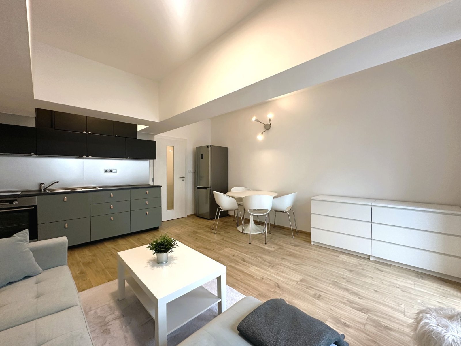 - obytná část nabízí plně vybavenou kuchyňskou linku se spotřebiči – trouba, varná deska, digestoř a lednice s mrazákem