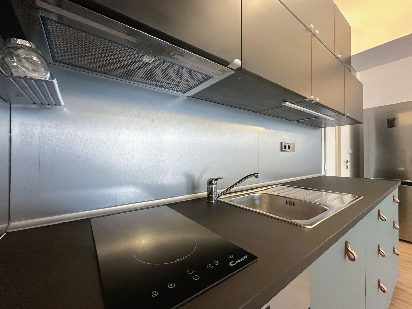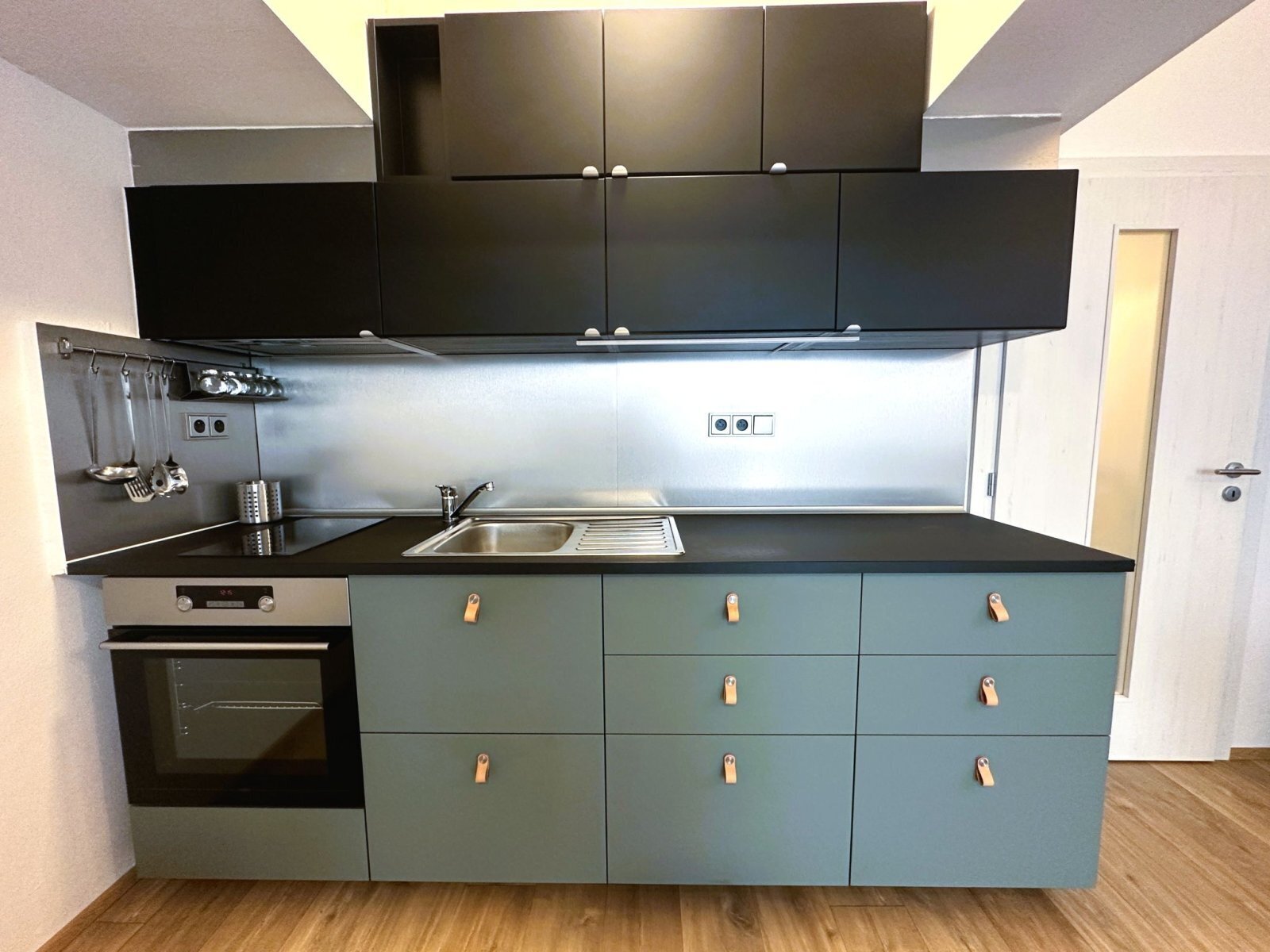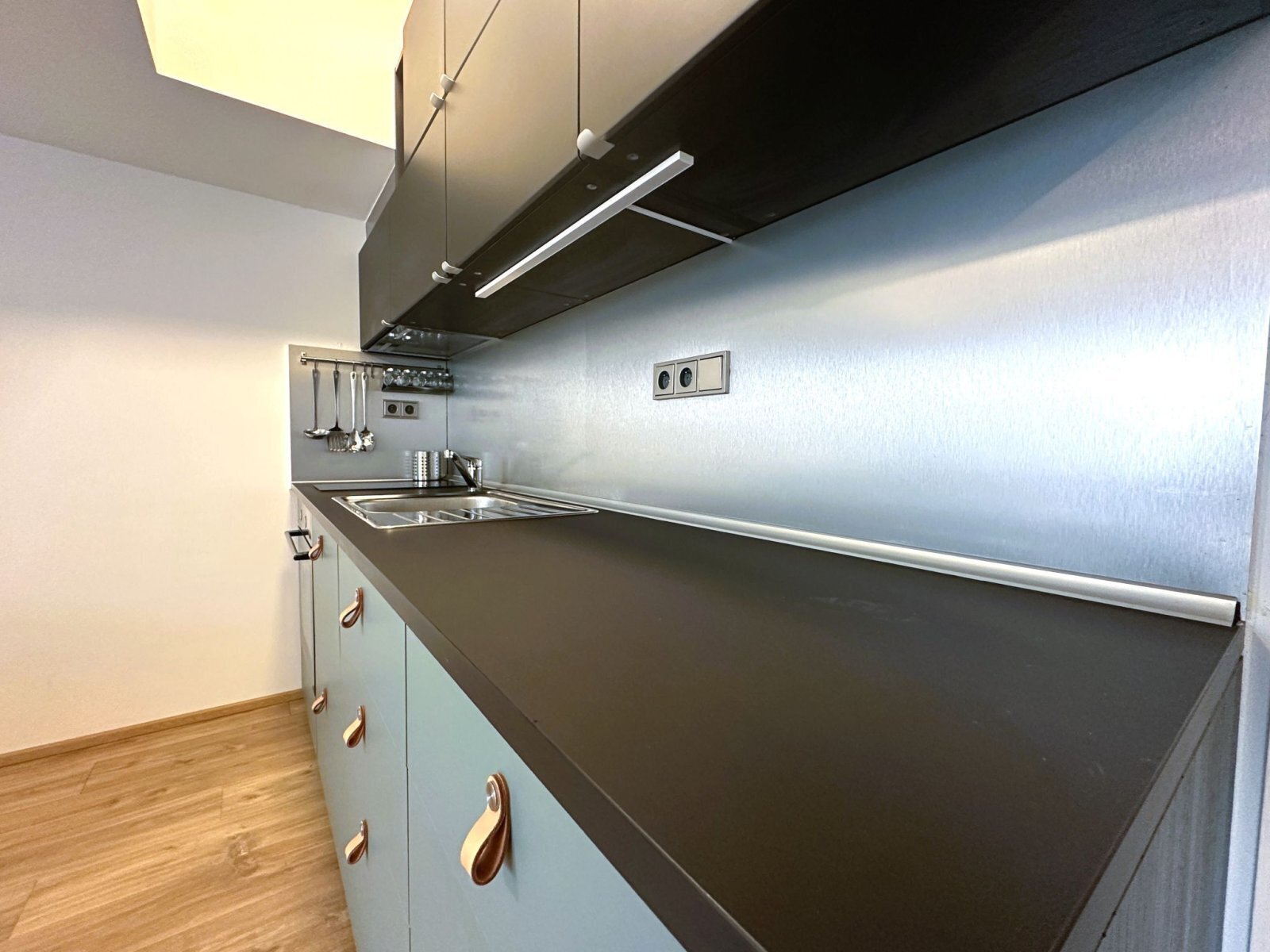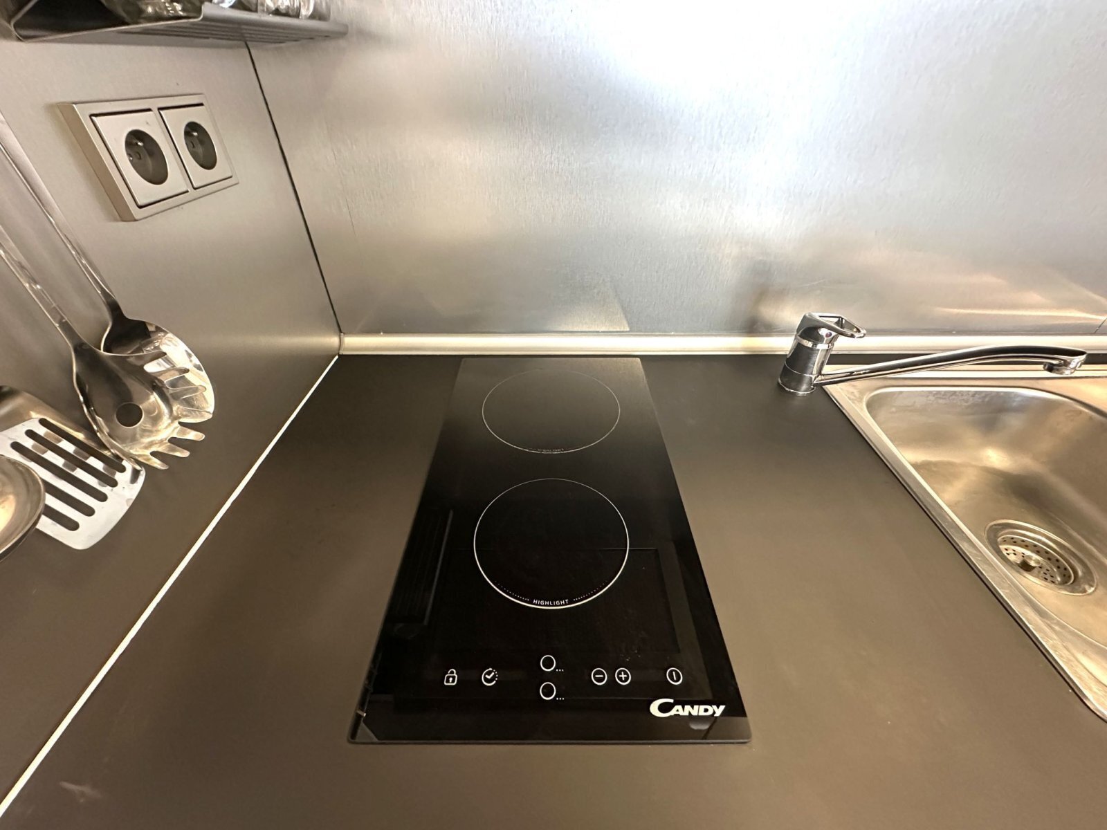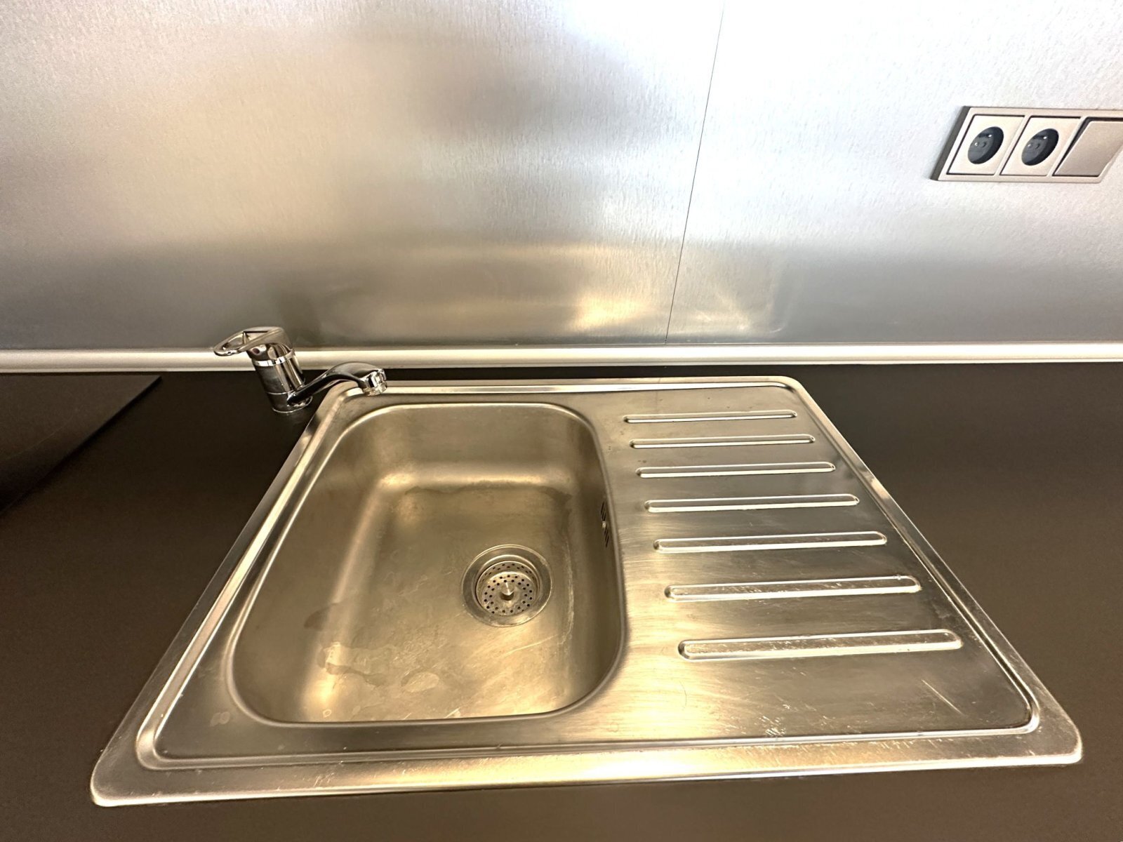 - obytná část nabízí plně vybavenou kuchyňskou linku se spotřebiči – trouba, varná deska, digestoř a lednice s mrazákem