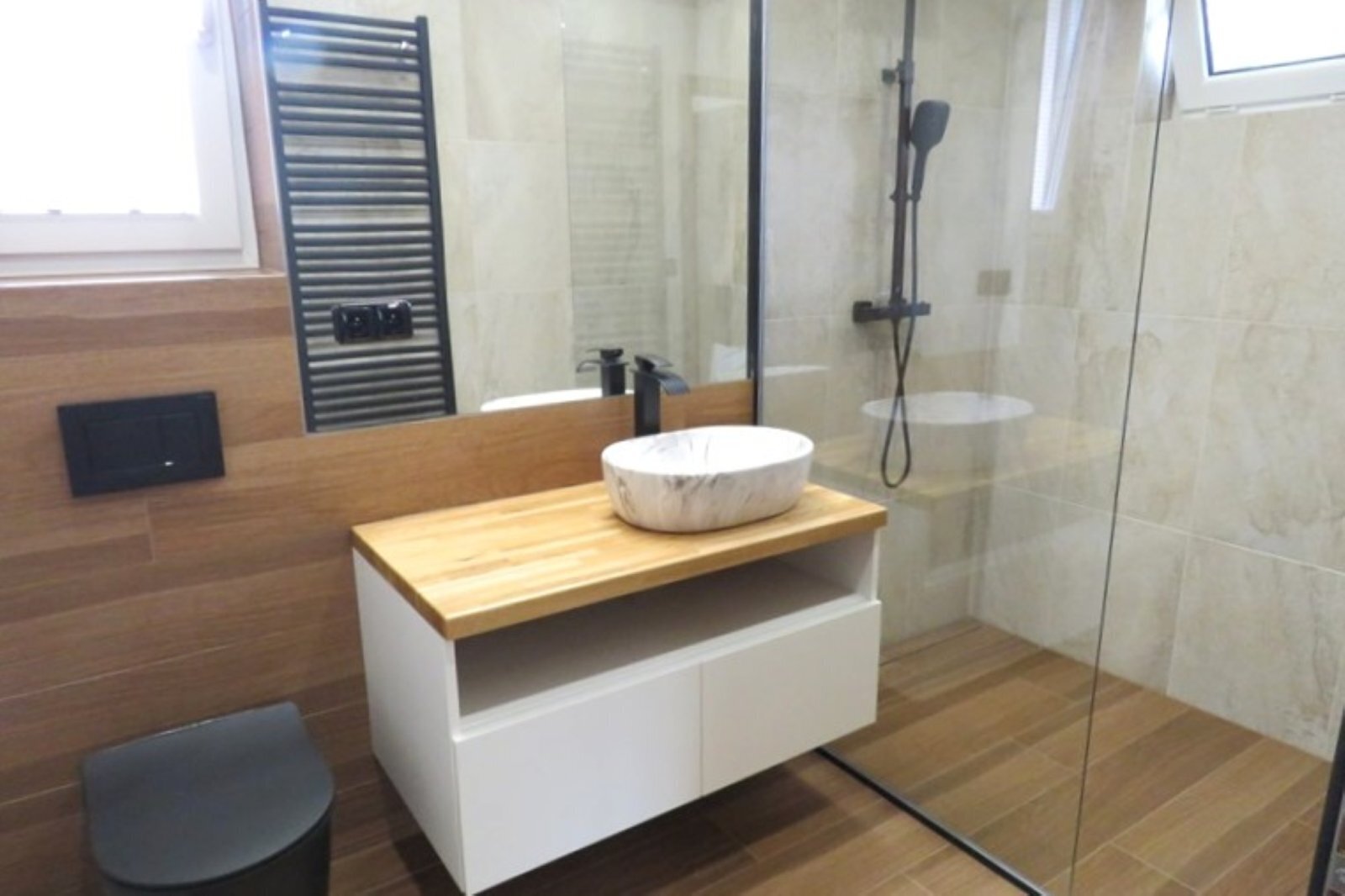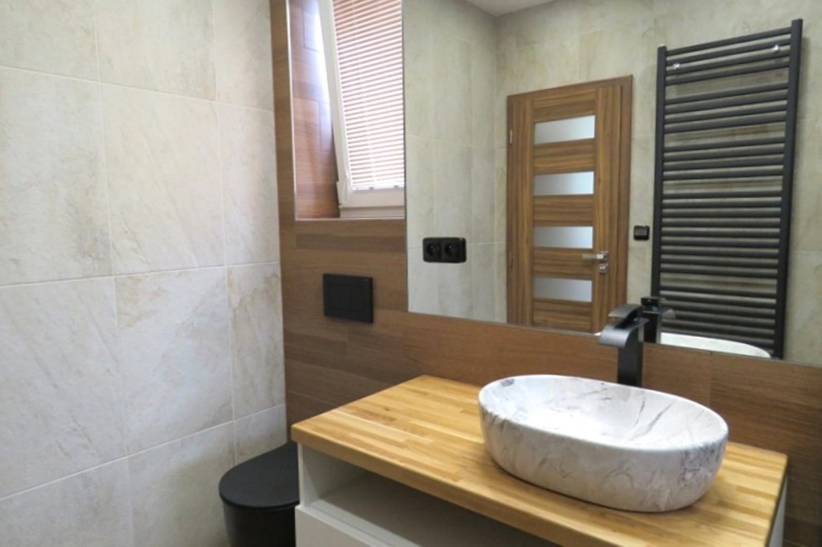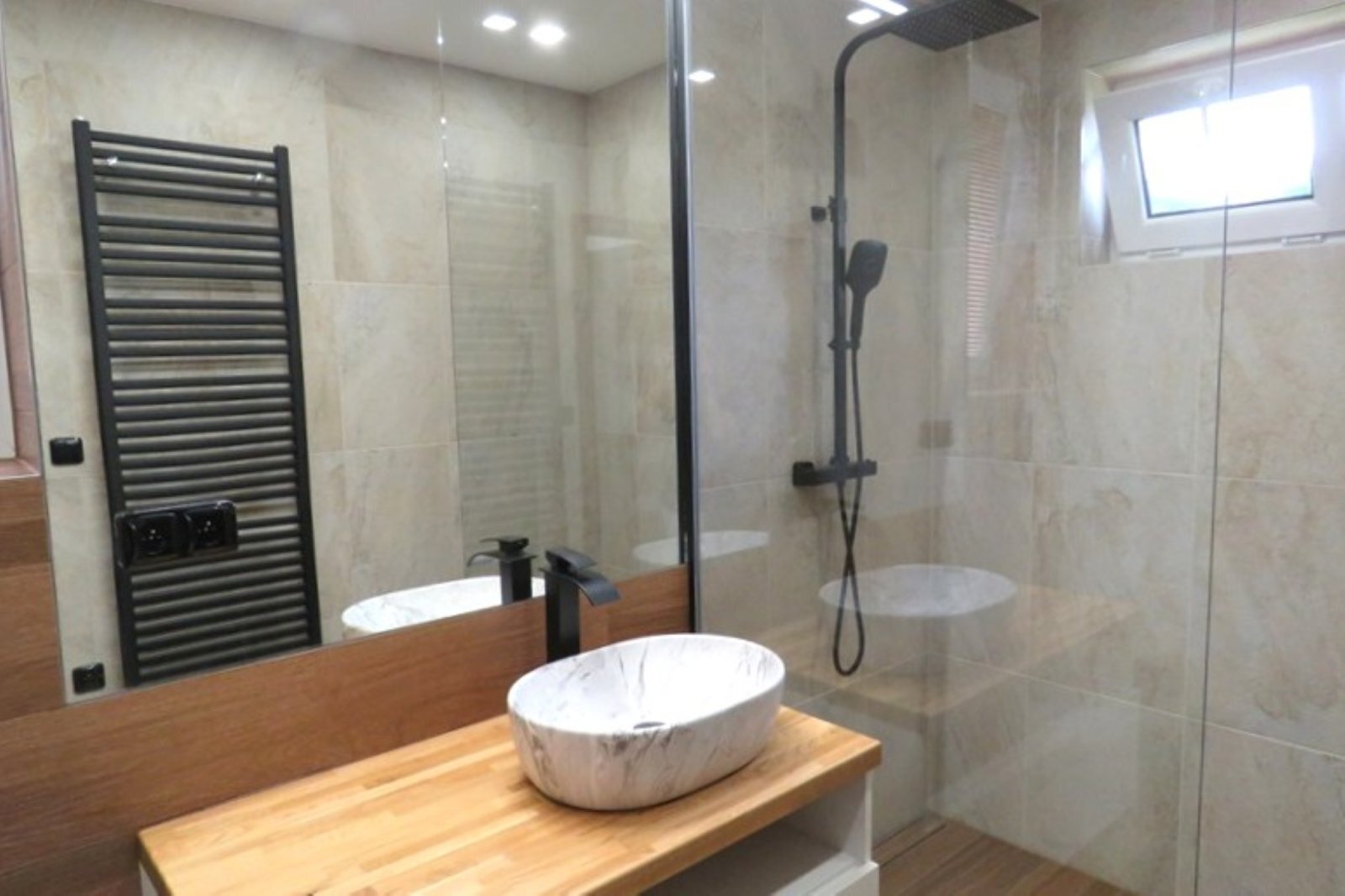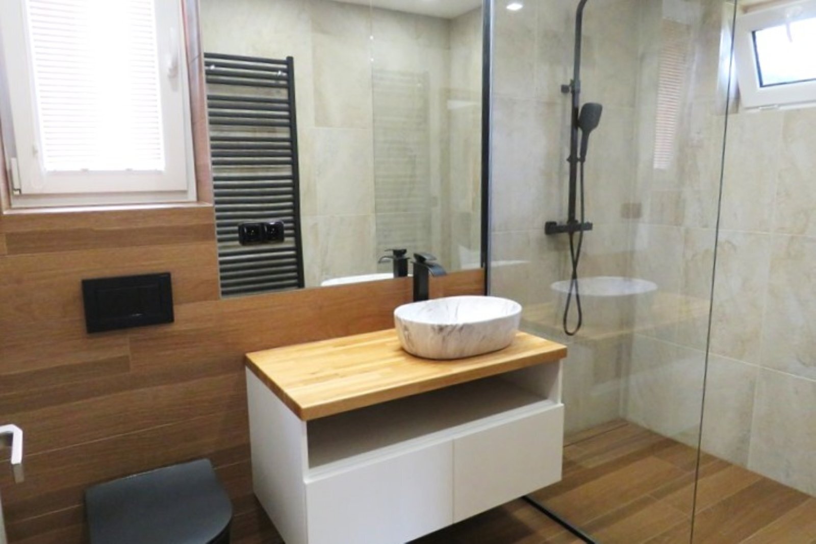 - prostorná koupelna (7,5 m²) s podlahovým vytápěním, sprchovým koutem, WC a oknem